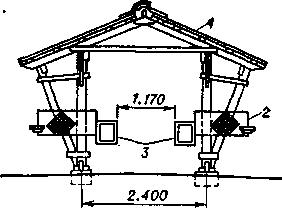 Шед из деревянных конструкций с клетками для норок: / — навес; 2 — клетка;