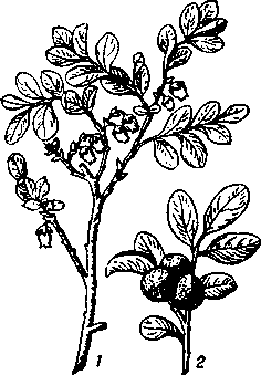 Голубика: 1— ветвь с цветками; 2 — ветвь с плодами
