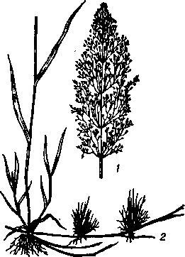 Полевица побегообразующая: 1 — метёлка; [метелка;] 2 — нижняя часть растения