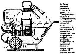УДПС-1 включает водокольцевой вакуумный насос 12, электродвигатель 3, бак для воды 6, вакуумный бачок, вакуумметр 11, вакуумный кран 8, доильный аппарат 4, электрокабель с вилкой 2, пульт управления 5, колеса 7, ручку 1, площадку для доильного ведра с ограждениями 13, муфту с кожухом 14 и регулятор вакуума 9.