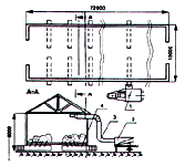Досушивать сено рекомендуется в типовом сенохранилище размером 18х72 м (рис. 3). Пол в хранилище - решетчатый из брусьев, под которыми находятся треугольные решетчатые желоба длиной 8,5 м, по 24 шт. с каждой стороны. Следует использовать 4 нагревательных установки также по 2 с каждой стороны.
