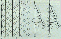 Накручиваю заготовки на основной, более крепкий шпагат, на конце его делаю петлю, которую можно держать четырьмя пальцами левой руки. Закрепляю первую заготовку перевязанного лука за петлю основы, затем левой рукой держу петлю вверху, а правой рукой вращаю конец основы вокруг оси против часовой стрелки (см. схему). Также накручиваю вторую, третью и четвертую заготовки. Оставшиеся концы ниток и основы закрепляю вокруг последних луковиц.