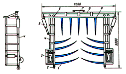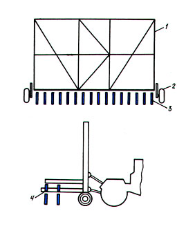 На раме через 1000 мм приварены заостренные штыри из труб длиной 2000 мм. Справа и слева на расстоянии 1000 мм от краев при помощи шкворней диаметром 45 мм крепятся боковые рамы. Длина их 5000 мм и высота 1500 мм.