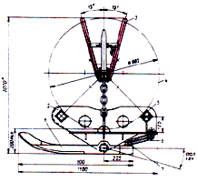 Простые и оригинальные крепления позволяют смонтировать лыжный ход в течение 5-7 мин. Для этого необходимо домкратом приподнять на 25...30 см колесо и подвести под него приспособление. Колесо находится в коробе, имеющем упоры, фиксирующие его положение, а короб, в свою очередь, с помощью захватов, натяжного устройства и рычага крепится на колесе. Особенность конструкции такого хода состоит в том, что лыжа, прикрепленная к коробу в нижней части с помощью шарнира, подвижна в вертикальной плоскости, поворачиваясь на 15° вверх и вниз. В задней части лыжи установлена амортизационная пружина. При движении по пересеченной местности, на поле, сгруживании земли перед носовой частью лыжи она легко преодолевает барьер.