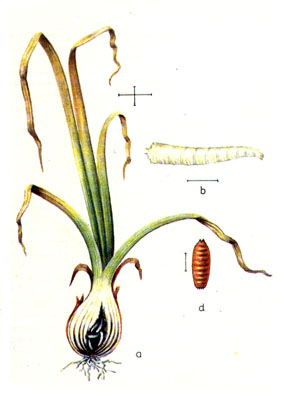 через 3-8 дней выходят личинки и вбуравливаются в луковицы. У поврежденных