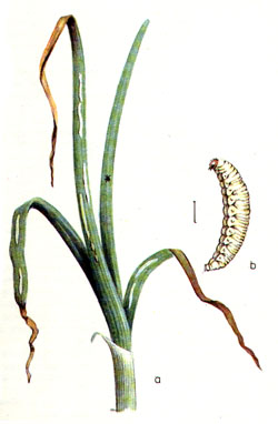 длинной до 7 мм. Они выгрызают в мякоти листьев ходы. Листья желтеют и