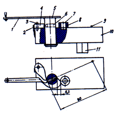 Чтобы изготовить шплинты для пальцев гусениц тракторов, нужно отрезать проволоку диаметром 8 мм длиной 80 мм и загнуть ее один конец. Используя приспособление (см. рисинок), можно этот процесс облегчить. Проволоку пропускают через отверстие до фиксатора; поворачивая стержень за ручку, срезают проволоку. Затем, поворачивая ручку дальше, один конец шплинта загибают при помощи подвижного ролика. Поворачивая ручку обратно,снимают готовый шплинт. 2. Приспособление для изготовления шплинтов к пальцам: 1 — ручка; 2 — пружина; 3 — ось ножа; 4 — противорежущий нож; 5 — стержень; б — отверстие диаметром 8 мм; 7 — ось; 8 — ролик; 9— фиксатор; 10 — станина приспособления; 11 — прямоугольник для установки в тиски |