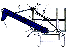 ![]() 3. Загрузчик сеялок: I, 7 — шарниры; 2— гидромотор; 3 — выгрузной шнек; 4 — шарнир навески; 5 — рукав; 6 — растяжки; 8 — приемный лоток; 9 — стойка; 10 — заслонка; 11 — механизм перемещения заслонки |