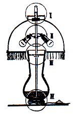 Отступив от верхнего конца не расстояние 130 мм, просверлим отверстие диаметром 5 мм. Декоративный "шпиль" на раму также предпочтителен латунный, с резьбой М16,он одновременно служит контргайкой для крепления абажура (см. рисунок).