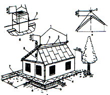 ![]() 2. Устройство стержневого молниеотвода, способы определения его высоты и зоны зашиты: а - общий вид; б - вариант крепления токоотвода к дереву; 1 - молниеприемник; 2 -токоотвод; 3 - заземлитель; 4 - резиновая прокладка (трубка); 5 - вязальная проволока |
