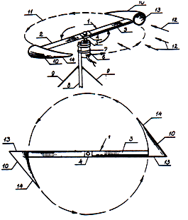 ![]() Летающий колпак: 1 - винт; 2, 3 - лопасти винта; 4 - центральная часть винта; 5 - вал; 6 - электрический генератор; 7 - стяжной хомут; 8 - верхняя часть опорной стойки; 9 - оттяжки крепления стойки; 10 - конические колпаки; 11 - траектория движения концов винта; 12 - направление ветра; 13 - основание конического колпака; 14 - суживающаяся вершина колпака |