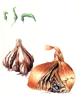 ЧЕСНОК. Применяют чеснок для опрыскивания растений лука против корневого клеща и луковой мухи и опыливания против луковой мухи, паутинного клеща и тли. Получение настоя: 1. 0,5 кг луковиц чеснока растирают, заливают 3 л воды, настаивают в темном месте 5 суток, затем процеживают. Перед применением 60 мл раствора разбавляют в 10 л воды. 2. 100-150 г сухих чешуй и листьев чеснока заливают 10 л воды и настаивают в течение суток. Для опыливания пользуются порошком из сухих растений чеснока, собранных и высушенных во время стрелкования.