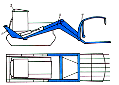 | Схема скирдовоза: 1, 9 — штыри; 2, 3 — колеса; 4, 8 — боковая и передняя рамы; 5 — гидроцилиндр; 6 — шарнирное соединение; 7 — навеска |