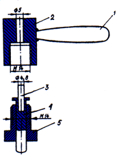 Во время ремонта техники часто нужны заклепки. Можно воспользоваться приспособлением, которое позволяет быстро делать заклепки разной длины (см. рисинок). Оно простое, и сделать его несложно. 1. Приспособление для приготовления заклепок: 1 — ручка; 2 — оправка; 3 — стержень; 4 — толкатель-упор; 5 — штуцер для регулировки длины заклепок |