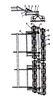 Для рыхления почвы можно использовать специальное приспособление (см. рисинок),устанавливаемое на культиватор КПС-4. Оно состоит из двух пар рыхлителей. Каждый выполнен в виде пространственной цилиндрической решетки из прутков диаметром 12 мм, приваренных к дискам. Передний рыхлитель в каждой паре имеет правую навивку прутков, задний —левую. Диски закреплены на оси, которая вращается в подшипниках. С помощью кронштейнов рыхлители крепятся к балке. Через тягу они шарнирно соединены со стойкой рамы культиватора, а также с кронштейнами. К раме устройство присоединяют с помощью четырех хомутов и болтов крепления продольных балок к поперечным. Особенность устройства — способность увеличивать давление на почву через пружины, установленные на тягах. Усилие пружин регулируют перестановкой нижних осей в отверстиях тяг. Верхние оси служат для удержания устройства в транспортном положении. Перед началом работы рыхлители тягами устанавливают в одной плоскости с опорными колесами культиватора. Производительность за 1 ч чистого времени 4,8 га, скорость 12 км/ч, ширина захвата 4,2 м. 5. Рыхлительно-прикатывающее устройство: 1 — стойка; 2 — хомут; 3, 10, 11 кронштейны; 4 — пружина; 5, б, 7 — тяги; 8 — рама; 9, 12 — передний и задний рыхлители; 13 — диски; 14 — ось; 15 –балка |