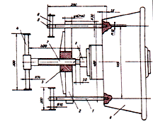 Эту работу быстрее и легче выполнить, если воспользоваться приспособлением (рис.3). Оно состоит из двух объемных тяг диаметром 20 мм, длиной 250 мм с резьбой М 12х25 для тормозного барабана и диаметром 20 мм, длиной 300 мм с резьбой М20х30 - для ступицы, а также винта длиной 300 мм с головкой под ключ на 36. На винт установлена траверса с приваренной к ней гайкой. Траверса имеет два отверстия 20 мм и укреплена двумя косынками.