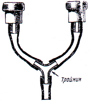 При работе ручным опрыскивателем, например популярным среди садоводов ГШ-2, та часть кроны, которая расположена ближе к наконечнику, опрыскивается хуже — в этом месте факел получается узким. Во избежание этого обычно приходится то и дело отходить от дерева и опять возвращаться к нему. Московский садовод-любитель В. Г. Сергеенко предлагает простой выход из положения: купите в магазине лабораторного оборудования пластмассовый тройник и с его помощью подсоедините к шлангу насоса не один, а два распылителя. Один из них отрегулируйте на длинный и узкий факел, а другой — наоборот, на короткий и широкий. Качать практически не тяжелее, чем раньше, а производительность увеличивается вдвое; вы одновременно опрыскивает и те ветви, что ближе к вам, и те, что подальше. Факелы можно сделать и одинаковыми:тогда вы будете вести опрыскивание на одну и ту же глубину с вдвое большим охватом — вместо 3—5 минут обработка дерева займет не больше 2 минут.