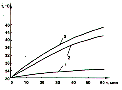 | Рис. 2. Кривые разгона температуры: 1,2 - при вращении соответственно только внутреннего или наружного ротора; 3 - при вращении обоих роторов |