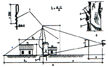 ![]() 2. Устройство стержневого молниеотвода, способы определения его высоты и зоны зашиты: а - общий вид; б - вариант крепления токоотвода к дереву; 1 - молниеприемник; 2 -токоотвод; 3 - заземлитель; 4 - резиновая прокладка (трубка); 5 - вязальная проволока |