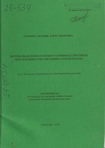 Бубнова Л. А., Методы выделения холодоустойчивых генотипов при селекции сои для ранних сроков посева: автореферат диссертации — 2025 г.