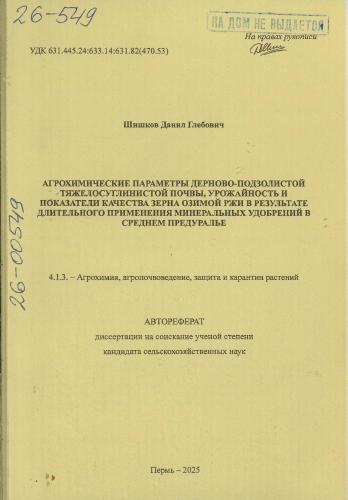 Шишков Д. Г., Агрохимические параметры дерново-подзолистой тяжелосуглинистой почвы, урожайность и показатели качества зерна озимой ржи в результате длительного применения минеральных удобрений в Среднем Предуралье: автореферат диссертации — 2025 г.