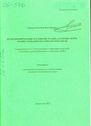 Гришин Е. В., Функционирование и развитие малых аграрных форм хозяйствования Краснодарского края: автореферат диссертации — 2025 г.