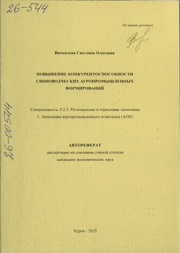 Виткалова С. О., Повышение конкурентоспособности свиноводческих агропромышленных формирований: автореферат диссертации — 2025 г.