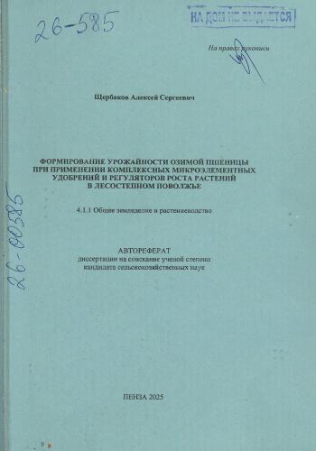 Щербаков А. С., Формирование урожайности озимой пшеницы при применении комплексных микроэлементных удобрений и регуляторов роста растений в лесостепном Поволжье: автореферат диссертации — 2025 г.
