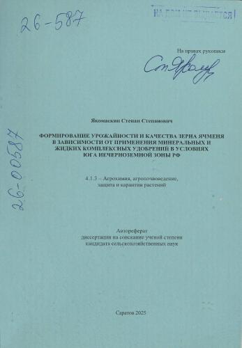 Якомаскин С. С., Формирование урожайности и качества зерна ячменя в зависимости от применения минеральных и жидких комплексных удобрений в условиях юга Нечерноземной зоны РФ: автореферат диссертации — 2025 г.