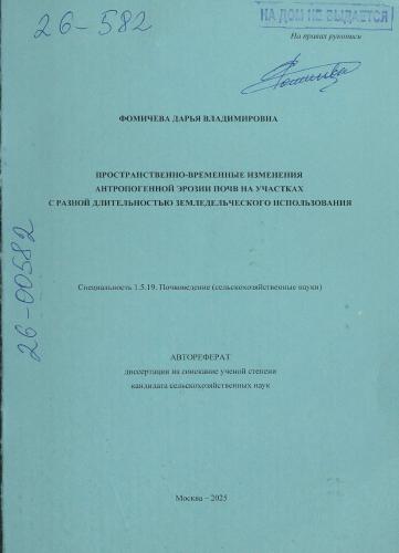 Фомичева Д. В., Пространственно-временные изменения антропогенной эрозии почв на участках с разной длительностью земледельческого использования: автореферат диссертации — 2025 г.