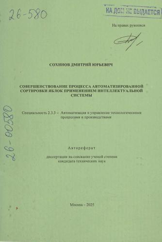 Сохинов Д. Ю., Совершенствование процесса автоматизированной сортировки яблок применением интеллектуальной системы: автореферат диссертации — 2025 г.