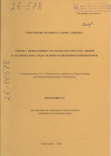 Симачкова М. С., Оценка эффективности технологических линий и технических средств приготовления комбикормов: автореферат диссертации — 2025 г.