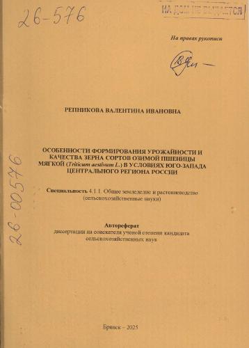Репникова В. И., Особенности формирования урожайности и качества зерна сортов озимой пшеницы мягкой (Triticum aestivum L.) в условиях юго-запада Центрального региона России: автореферат диссертации — 2025 г.