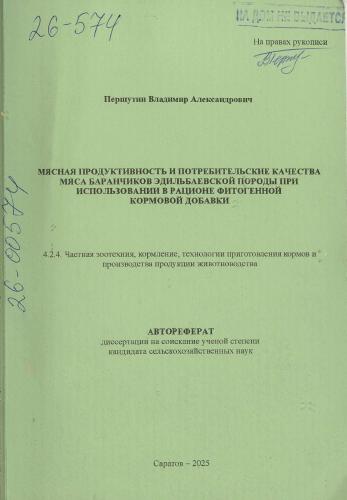 Першутин В. А., Мясная продуктивность и потребительские качества мяса баранчиков эдильбаевской породы при использовании в рационе фитогенной кормовой добавки: автореферат диссертации — 2025 г.