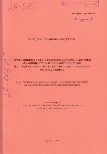 Поздняков М. А., Эффективность скармливания кормовой добавки "РуминПро ТМР" и доломитовой муки на продуктивность и качественные показатели молока у коров: автореферат диссертации — 2025 г.