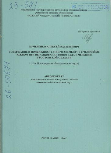 Кучеренко А. В., Содержание и подвижность микроэлементов в чернозёме южном при выращивании винограда и черешни в Ростовской области: автореферат диссертации — 2025 г.