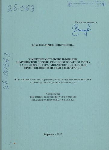 Власова И. В., Эффективность использования лимузинской породы крупного рогатого скота в условиях Центрально-Черноземной зоны при стойловой системе содержания: автореферат диссертации — 2025 г.