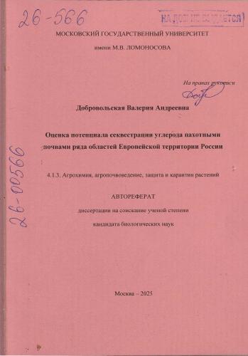 Добровольская В. А., Оценка потенциала секвестрации углерода пахотными почвами ряда областей Европейской территории России: автореферат диссертации — 2025 г.