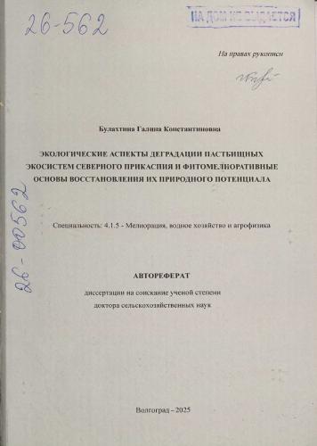 Булахтина Г. К., Экологические аспекты деградации пастбищных экосистем Северного Прикаспия и фитомелиоративные основы восстановления их природного потенциала: автореферат диссертации — 2025 г.