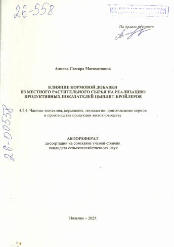Алиева С. М., Влияние кормовой добавки из местного растительного сырья на реализацию продуктивных показателей цыплят-бройлеров: автореферат диссертации — 2025 г.