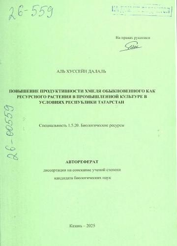 Аль Хуссейн Д., Повышение продуктивности хмеля обыкновенного как ресурсного растения в промышленной культуре в условиях Республики Татарстан: автореферат диссертации — 2025 г.