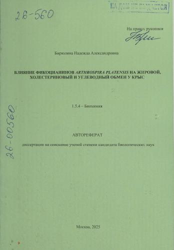 Бирюлина Н. А., Влияние фикоцианинов Arthrospira platensis на жировой, холестериновый и углеводный обмен у крыс: автореферат диссертации — 2025 г.