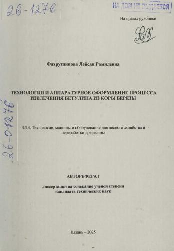 Фахрутдинова Л. Р., Технология и аппаратурное оформление процесса извлечения бетулина из коры берёзы: автореферат диссертации — 2025 г.