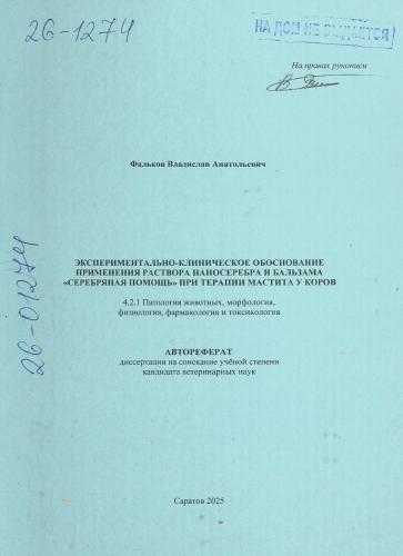 Фальков В. А., Экспериментально-клиническое обоснование применения раствора наносеребра и бальзама "Серебряная помощь" при терапии мастита у коров: автореферат диссертации — 2025 г.