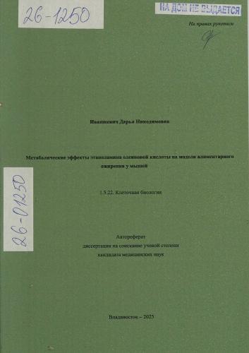 Ивашкевич Д. Н., Метаболические эффекты этаноламина олеиновой кислоты на модели алиментарного ожирения у мышей : автореферат диссертации — 2025 г.