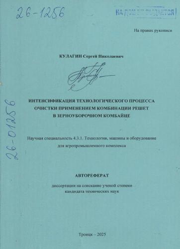 Кулагин С. Н., Интенсификация технологического процесса очистки применением комбинации решет в зерноуборочном комбайне: автореферат диссертации — 2025 г.