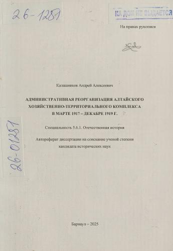 Калашников А. А., Административная реорганизация Алтайского хозяйственно-территориального комплекса в марте 1917 - декабре 1919 г.: автореферат диссертации — 2025 г.