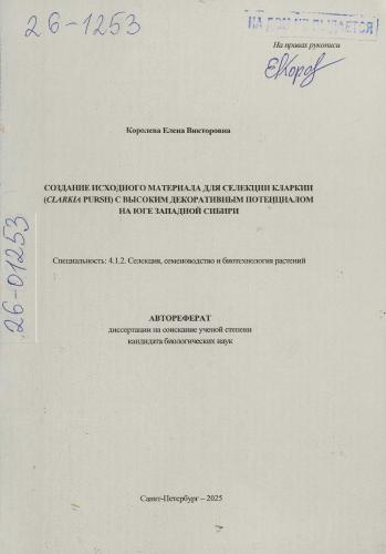 Королева Е. В., Создание исходного материала для селекции кларкии (Clarkia Pursh) с высоким декоративным потенциалом на юге Западной Сибири: автореферат диссертации — 2025 г.