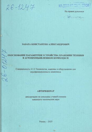 Забара К. А., Обоснование параметров устройства хранения техники в агропромышленном комплексе: автореферат диссертации — 2025 г.