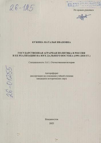 Кужина Н. И., Государственная аграрная политика в России и ее реализация на юге Дальнего Востока (1991-2010 гг.): автореферат диссертации — 2025 г.